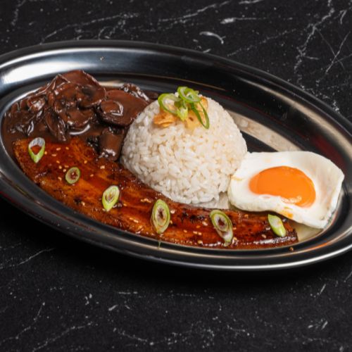 Arroz, huevo, panceta melosa y salsa de champiñones al Pedro Ximénez. Pensado para mezclar y disfrutar.
