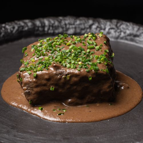 Carrilleras de vaca cocinadas a baja temperatura al vino tinto, con una salsa de sus propios jugos