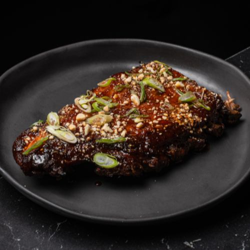 Costillas marinadas 24 horas y cocinadas a baja temperatura, glaseadas al estilo coreano. Tiernas, intensas y terminadas con cacahuete y cebollino.