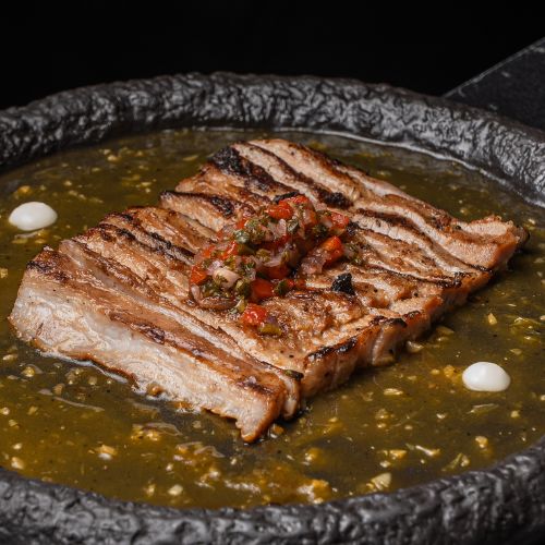 Secreto ibérico al josper macerado en cítricos y soja, con notas de ajo y jengibre. Jugoso, intenso y lleno de matices.
