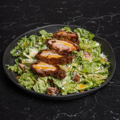 Lechuga fresca con pollo crujiente, Grana Padano, salsa César y yema cremosa. Equilibrio entre frescura y tentación.